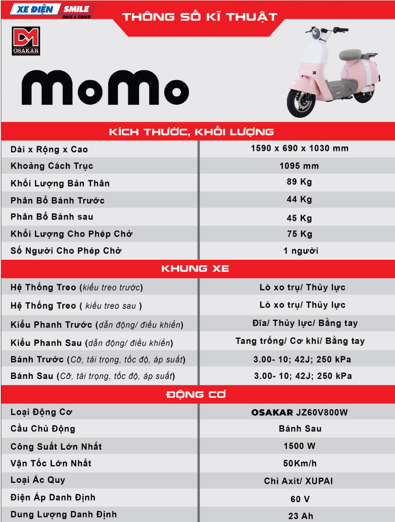 Với thiết kế nhỏ gọn, đáng yêu cùng bảng màu đa dạng và khả năng vận hành bền bỉ, xe điện Osakar Momo 5 bình là sự lựa chọn phù hợp với các bạn nữ tuổi teen, yêu thích sự ngọt ngào, dịu dàng. Đây không chỉ là phương tiện di chuyển mà còn là người bạn đồng hành tin cậy, giúp bạn tự tin thể hiện phong cách cá nhân trên mọi nẻo đường.
