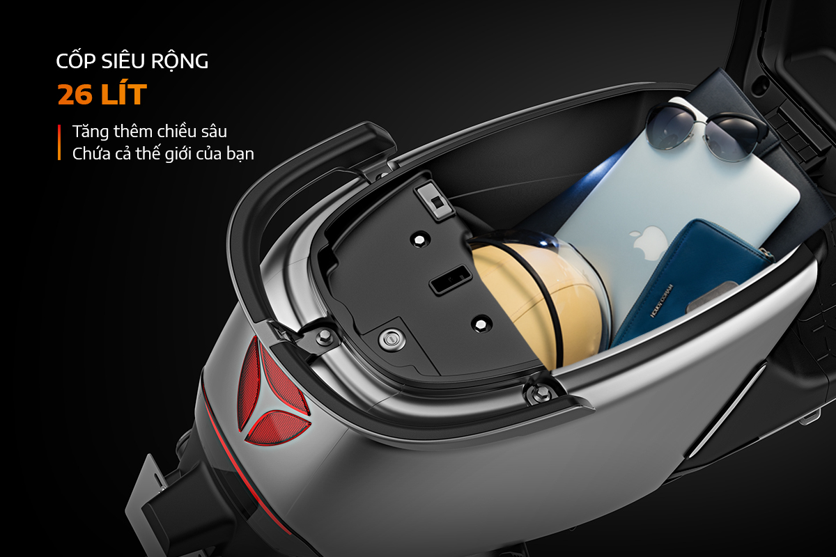 - Cốp xe rộng rãi 26 lít, đựng vừa 2 mũ bảo hiểm và các đồ dùng cá nhân